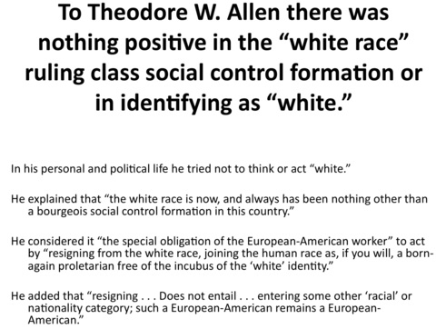 For the fullest treatment of the development of Theodore W. Allen’s thought see “The Developing Conjuncture and Some Insights from Hubert Harrison and Theodore W. Allen on the Centrality of the Fight Against White Supremacy” (Cultural Logic, 2010)