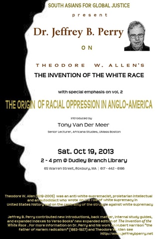 Saturday, 2 PM - 4:30 PM -- Theodore W. Allen's The Invention of the White Race (Verso Books) especially Volume 2 The Origin of Racial Oppression in Anglo-America will be discussed in a slide presentation/talk by Jeffrey B. Perry at the Dudley Branch Library 65 Warren Street, Roxbury, MA. Event sponsored by the July 26th Coalition and South Asians for Global Justice. Contact persons Mirna Lascano and Charlie Welch; Branch Librarian Janet Buda; opening presenter Tony Van Der Meer.