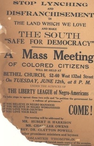 On June 12, 1917, a rally at Harlem’s Bethel African Methodist Episcopal Church, at 52-60 W. 132nd Street off Lenox Avenue drew 2,000 people to the founding meeting of Hubert Harrison’s “Liberty League,” the first organization of the militant “New Negro Movement.” The audience rose in support as Harrison demanded “that Congress make lynching a Federal crime.” urged support of resolutions calling for enforcement of the thirteenth, fourteenth and fifteenth amendments (outlawing slavery, establishing national citizenship and equal protection, and guaranteeing the right to vote), and called for democracy for “Negro-Americans.”