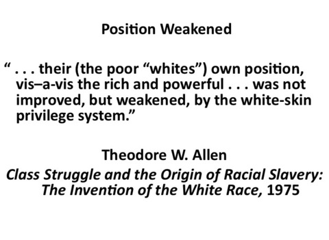 “ . . . their (the poor “whites”) own position, vis–a-vis the rich and powerful . . . was not improved, but weakened, by the white-skin privilege system.”