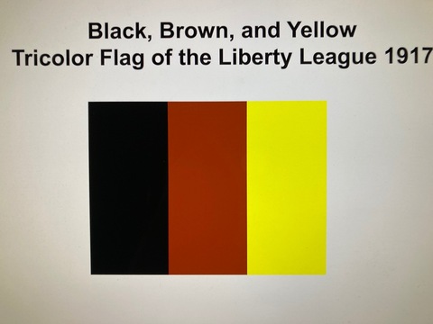 The Liberty League, in June 1917, also adopted a tricolor flag. Because of the "Negro's" "dual relationship to our own and other peoples," explained Harrison, "[we] adopted as our emblem the three colors, black brown and yellow, in perpendicular stripes." These colors were chosen because the "black, brown and yellow, [were] symbolic of the three colors of the Negro race in America." They were also, he suggested, symbolic of people of color world-wide. It was from this black, brown, and yellow tri-color that Marcus Garvey would later, according to Harrison, draw the idea for the red, black, and green tri-color racial flag which the UNIA would popularize, and which later would become identified as Black liberation colors.