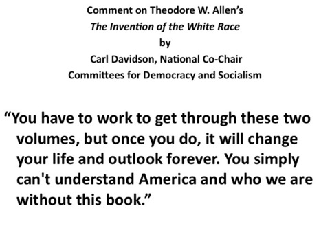 For information on Theodore W. Allen’s “The Invention of the White Race” Volume I: “Racial Oppression and Social Control" (including comments from scholars and activists, Table of Contents, and an overview of the volume) CLICK HERE Note – the new, expanded Verso Books edition of this volume includes new introductions and notes, an expanded index, and a lengthy and detailed internal study guide.
