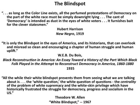 “All the while their white blindspot prevents them from seeing what we are talking about is . . . the ‘white question,’ the white question of questions - the centrality of the problem of white supremacy and the white-skin privilege which have historically frustrated the struggle for democracy, progress and socialism in the US.”